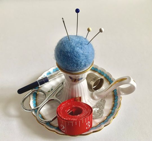 This exquisite pincushion began life as a fine bone china candleholder from the Trapnell Sprays range by Spode, England. Now thoughtfully upcycled into a practical and decorative sewing companion, it features a wet-felted wool ball to safely park your sewing needles, pins, or felting needles. The integrated tray is perfect for holding your thimble, scissors, tape measure, and other small tools—keeping everything you need in one elegant place.