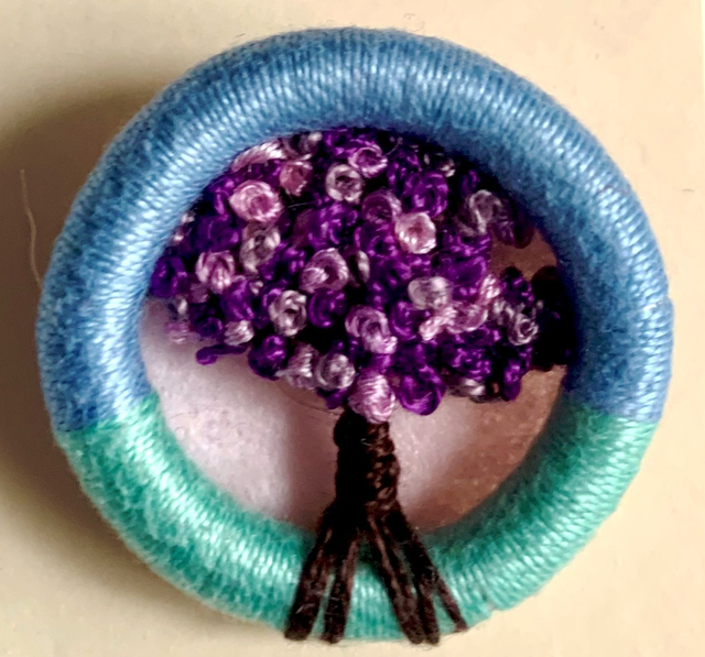 This 4cm (1.5") brooch is woven by hand using cotton perle thread in soft shades of blue, green and purple, wrapped around a sturdy plastic ring. The blossoms are embroidered French knots. Inspired by the traditional Dorset button style, it celebrates a craft that flourished in England from 1622 to 1850 and is now enjoying a vibrant revival in contemporary textile arts.