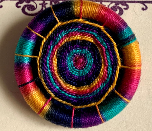 This 4cm (1.5") brooch is woven by hand using cotton perle thread in rainbow colors, wrapped around a sturdy plastic ring. Inspired by the traditional Dorset button style, it celebrates a craft that flourished in England from 1622 to 1850 and is now enjoying a vibrant revival in contemporary textile arts.