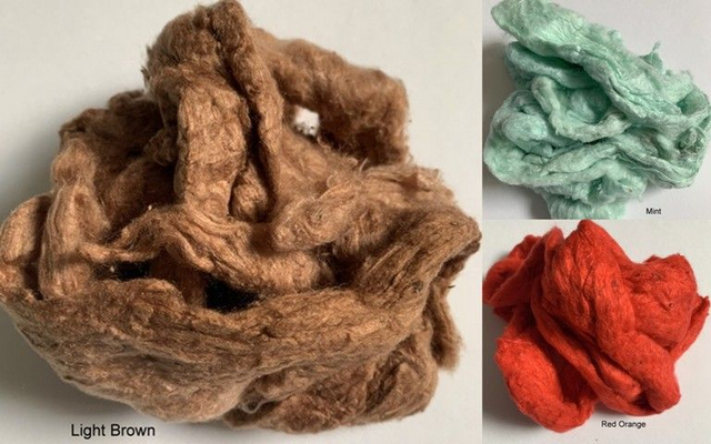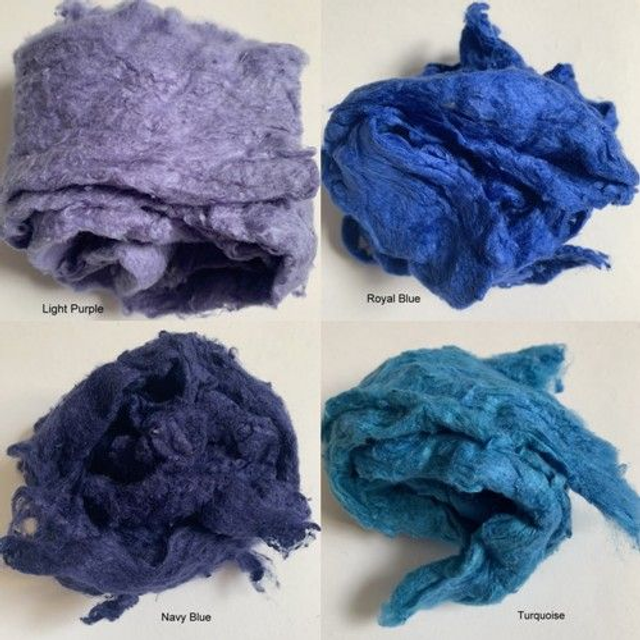 Wild silk noils from tussah silk worms (fed on juniper and oak), dyed in vibrant colours. Coarser and less lustrous than Mulberry silk, these noils add texture and interest to spinning batts, felting, and papermaking.
