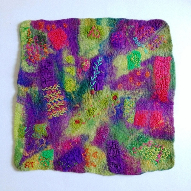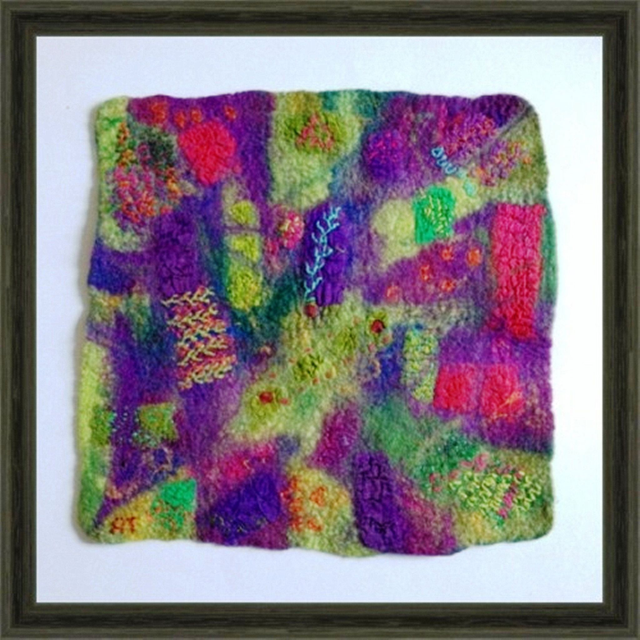 These two abstract landscape paintings are wet felted using a tapestry method. The colors are various shades of purple, pink and greens and are made with merino wool, sari silk ribbons, fruit bags and embroidered with cotton. There is a lot of texture in these Fiber Art works.