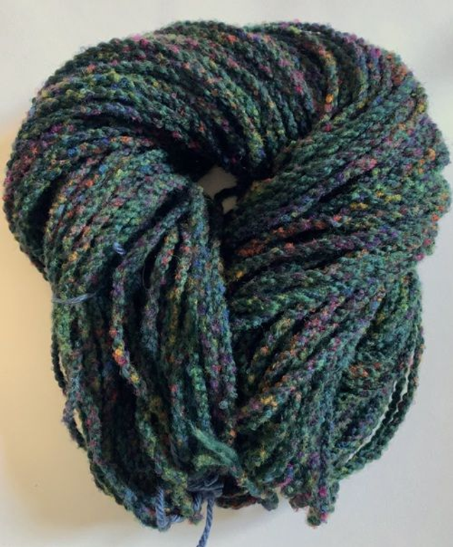This cosy beanie is hand knitted with a playful novelty yarn for the rolled brim and a re-spun cabled yarn (97% wool / 3% nylon) for the crown. The yarn is predominantly green with multicolour flecks, adding warmth and character to chilly days and evenings.