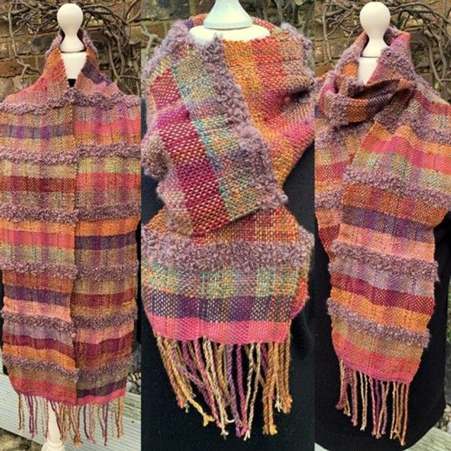 This beautiful handwoven scarf is part of the Autumn Berries Collection. It’s fun, fluffy, and warm, and can be styled in many different ways. Made primarily from handspun yarn blended with various luxury commercial yarns, it features merino wool, sari silk fibers, viscose, a touch of glitz, other silks, and Shetland wool, resulting in an incredibly soft yet durable fabric. Hand wash in cold water only.