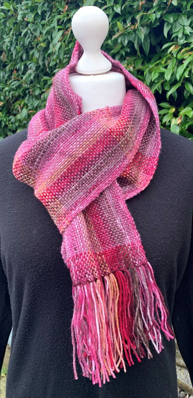 Brighten up your wardrobe with this soft and lightweight scarf, created with a variegated yarn in rich shades of pink, purple, peach, and red. It’s perfect for three-season wear—light enough for spring and autumn, yet warm enough to layer in winter.