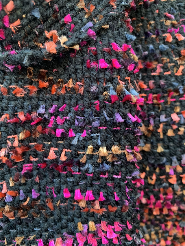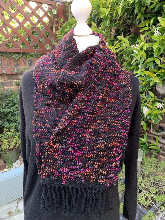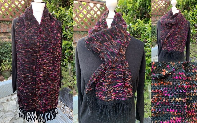 - Materials: Warp – acrylic blend; Weft – mixed colour eyelash yarn