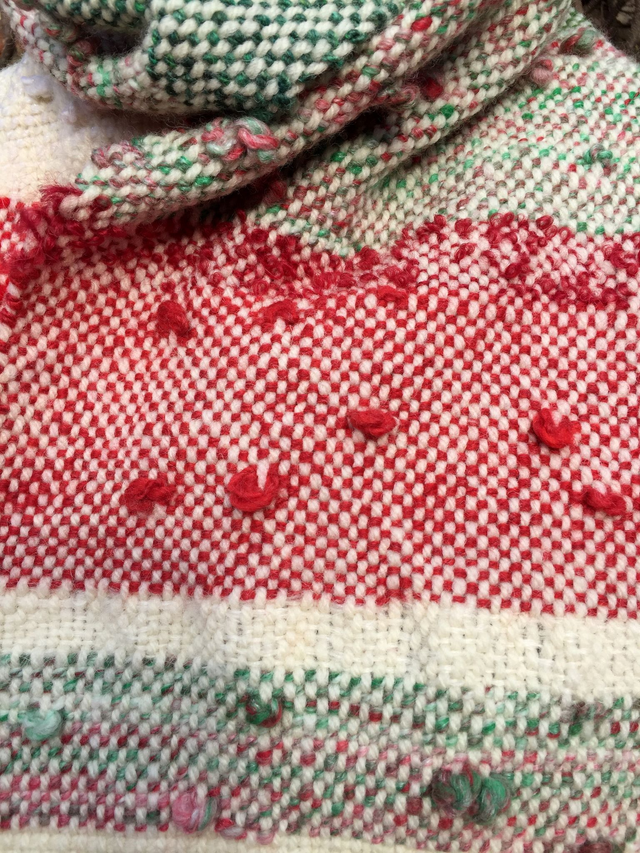 Celebrate the season in style with this festive handwoven infinity scarf, created freestyle in classic Christmas colors. Soft, cuddly, and full of texture, it’s woven with a mix of handspun yarns—merino, silk fibers, viscose, and other inclusions—blended with commercial mohair yarn and just a hint of sparkle for holiday cheer.