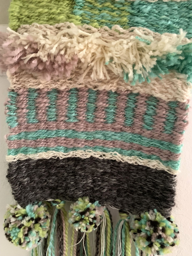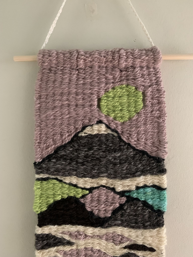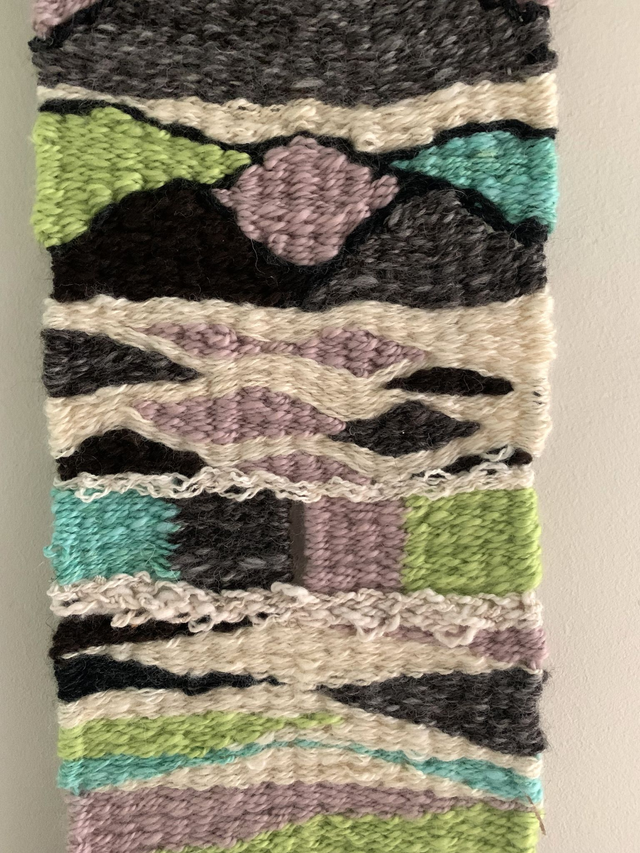 This abstract wall hanging is handwoven on a traditional peg loom — an ancient tool used in Nordic times for weaving rugs and coverings. Crafted entirely from handspun yarn made of 100% wool from various breeds, it features a mix of natural and dyed colours for rich texture and warmth.