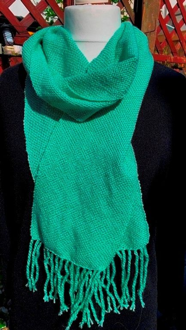 This handwoven scarf in pale mint green brings a soft shimmer to your wardrobe. Woven with an acrylic blend yarn that includes a tonal glitter strand, it catches the light subtly—adding a hint of sparkle without overwhelming. Lightweight yet warm, it’s ideal for three-season wear.