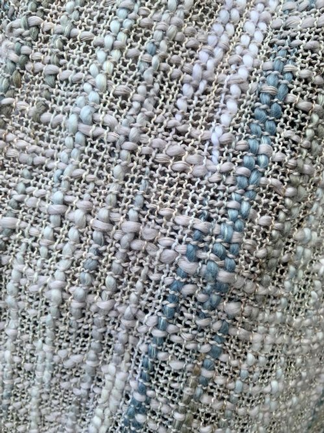 This handwoven scarf features a soft palette of taupe, cream, and pale blue-grey, crafted with a thick-and-thin cotton blend yarn that creates a beautifully open, textured weave. Finished with a twisted fringe, it’s a timeless four-season accessory—ideal for layering on cool summer evenings or adding subtle warmth year-round.
