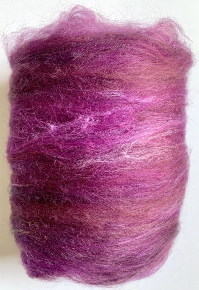 Tonal Luxury Art Batts are hand blended on the drum carder, created with fine Merino wool in shades of purple, viscose, sari silk fibers, hand dyed tussah silk, bamboo, and glitzy for a bit of sparkle. These Art Batts can be used for spinning art yarns and other textured yarns or can be used in your felting project. Each batt has no less than 90% merino wool with the rest made up of the bling fibers above for shine and texture. Limited Edition. Please note that colors seen on the computer may not reflect the actual color of the item. I make every effort to take photos in natural light, but there still may be discrepancies.
