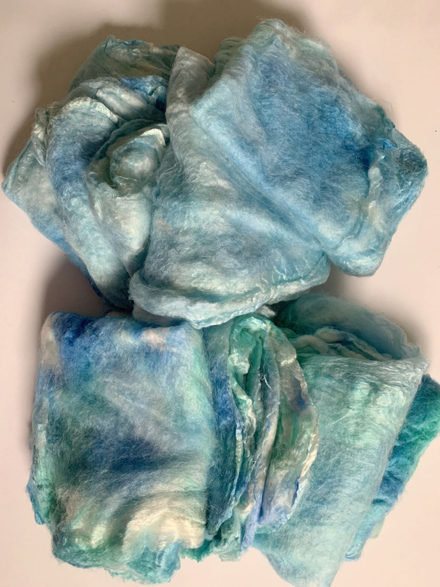 Mulberry Silk Hankies, Hand Dyed A Grade Mawata Silk Hankies, blu/turquoise/white, Bombyx Silk, Spinning, Felting, Textile Art, Paper Making