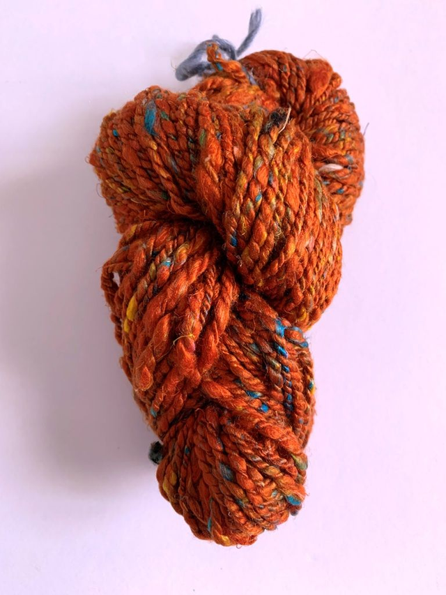 Vibrant recycled sari silk in rich orange/rust tones with pops of blue and other colours. Hand dyed and full of texture, these fibres are perfect for: