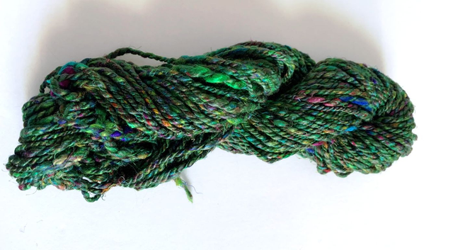 Vibrant recycled sari silk in rich green with pops of red, pink, blue, yellow and other colours. Hand dyed and full of texture, these fibres are perfect for: